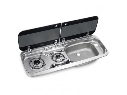 Vestavná kombinace dřezu a varné desky s dvěma hořáky Dometic HSG 2445 s krytem z teplotně odolného bezpečnostního skla a otvorem pro vodovodní baterii.