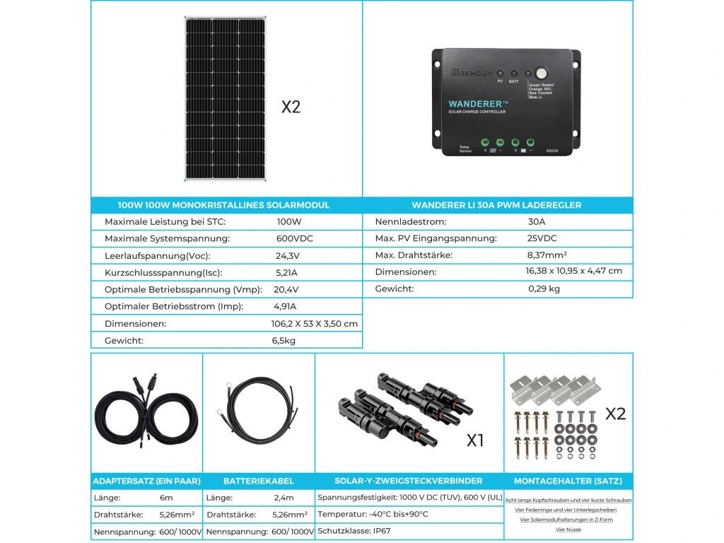 Renogy solární kit BALKONKRAFWERK 200W 12V startér s 30A PWM regulátorem pro karavany, obytné vozy a vestavby.