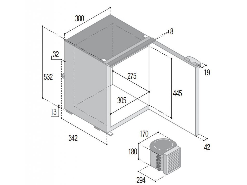 Vestavná chladnička s volnou chladící jednotkou, kterou tak lze snadno umístit například vedle chladničky, nebo do místa s lepší ventilací atp. Objem chladničky je 42 litrů, z toho mrazící přihrádka (mrazáček) má objem 3,6 litrů.